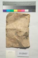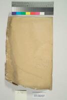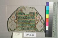 This is a painted glass inset for a tiq, or Torah scroll holder, used for reading the Torah in synagogue. It includes a transcription in Hebrew הר' אברהם יחזקאל למנו' בנו המ' הבחור צלאח נע' נפ' כא' ניסזתרער Ha-R[av] Avraham Yeḥezḳel le-Mano Beno ha-M’ ha-Baḥur Tsalaḥ Na’ Naf’ Ka’ Nisztra’r.
