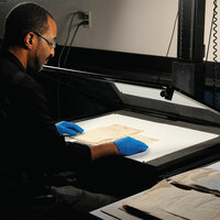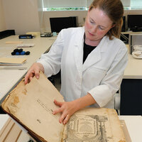 After the vacuum freeze-drying process, the conservation team unpacked the trunks and assessed the condition of the books and documents. As each item was uncovered, experts cataloged and created a web-based database inventory. Bibliographic research provided identification and description information for the database. However in many cases, title pages and other key information were missing, which required further research to provide the most accurate description possible.